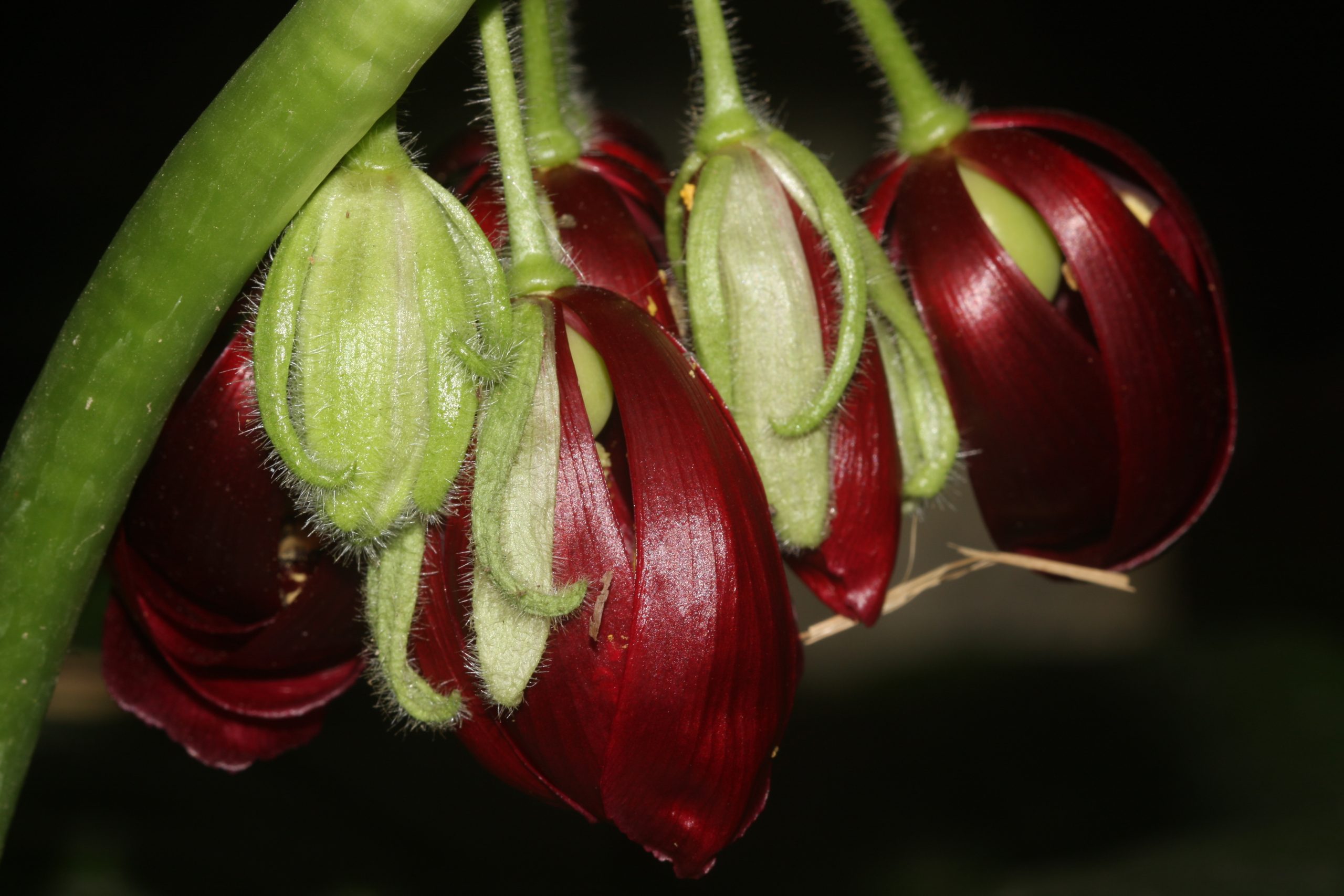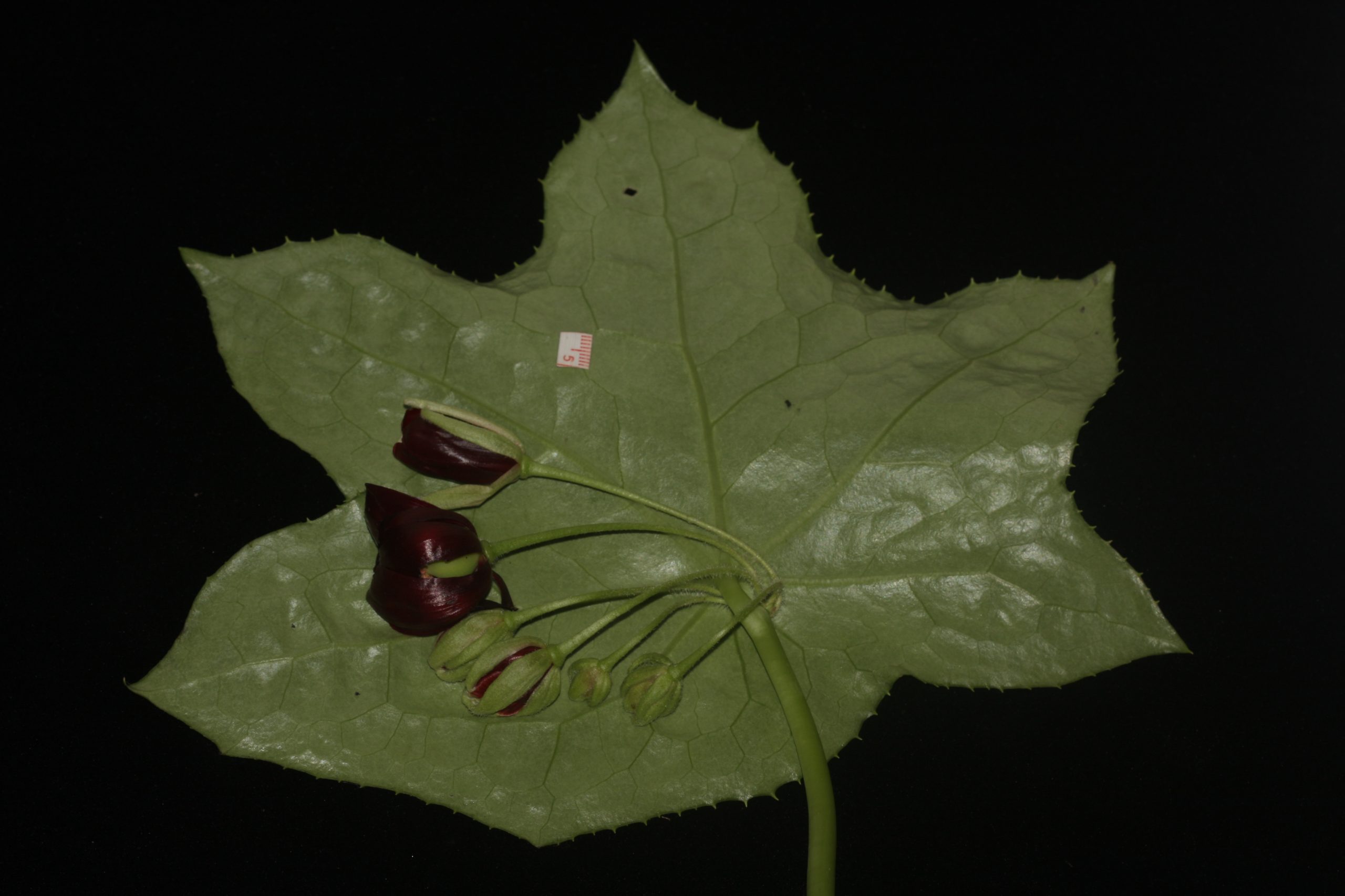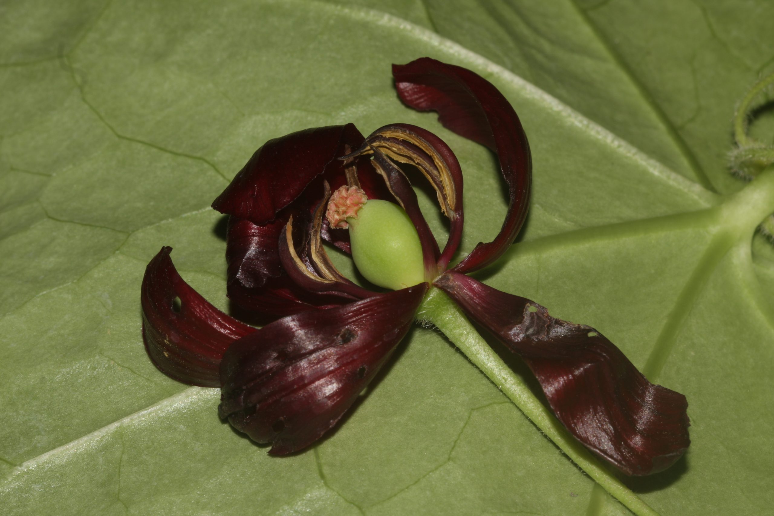 Hoa mọc đơn độc ở giữa hai cuống lá, màu đỏ sẫm hoặc tím nâu.