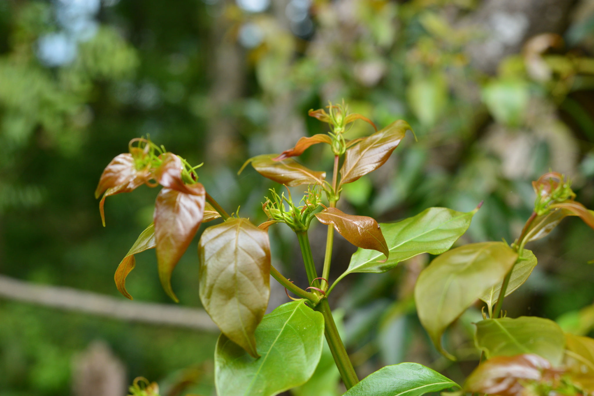 Lá: mọc đối, hình bầu dục thuôn, dài 8–12 cm, đầu nhọn, mặt trên xanh bóng, mặt dưới nhạt.