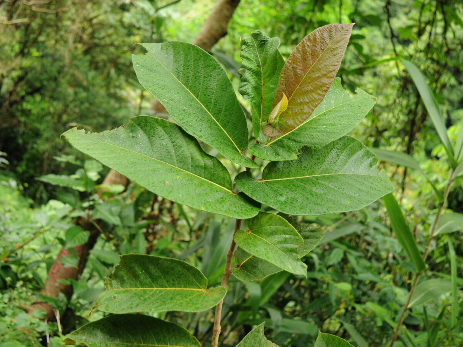 Lá: Mọc so le; phiến lá bầu dục hoặc hình tim lệch; gốc lá lệch rõ; mặt trên xanh đậm, mặt dưới nhạt.