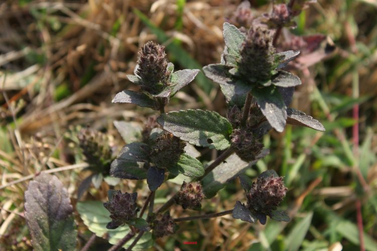 Lá mọc đối, phiến hình trứng hay bầu dục, mép nguyên; mặt trên xanh, mặt dưới tím đậm đặc trưng.