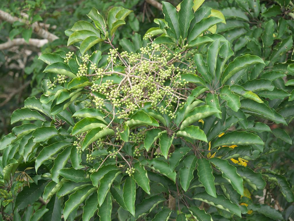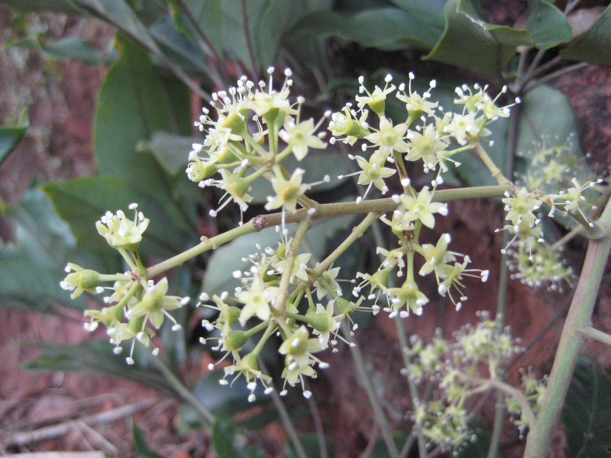 Hoa: nhỏ, màu trắng xanh, mọc thành tán kép ở ngọn cành.