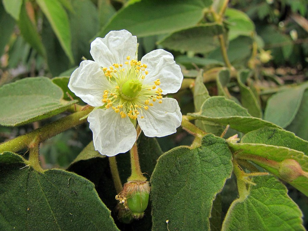 Hoa mọc đơn độc ở nách lá, 5 cánh trắng, nhiều nhị vàng, đường kính 1,5–2,5 cm.